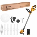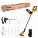 Двигатель: электрический (аккумулятор), 300 Вт • Аккумулятор: 12 В, 2 Ач, 2 шт • Покос: ширина 20 см • Вес косилки: 1.72 кг
