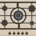 Поверхность: варочная панель • Тип поверхности: газовая • Рабочая поверхность: эмаль • Число конфорок: 5 • Установка: независимая • Газовые конфорки: всего - 5 (1 конфорка "Тройная корона") • Газ-контроль конфорок: есть • Тип управления: механическое • Переключатели: поворотные • Электроподжиг: есть, автоматический • Размеры: 690x520x100 мм • Размер ниши для встраивания: 560x490 мм • Цвет: панель - бежевый
