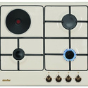 Поверхность: варочная панель • Тип поверхности: комбинированный • Рабочая поверхность: эмаль • Число конфорок: 4 • Установка: независимая • Электрические конфорки: чугунные; всего - 1 • Конфигурация электрических конфорок: 1 x 1000 • Газовые конфорки: всего - 3 • Газ-контроль конфорок: есть • Тип управления: механическое • Переключатели: поворотные • Электроподжиг: есть, автоматический • Размеры: 590x520 мм