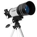 Телескоп F30070 STURMAN имеет объектив диаметром 70 мм, фокусное расстояние составляет 300 мм. Телескоп установлен на азимутальную монтировку и особенно хорошо подходит для наблюдения наземных объектов. В комплекте поставляются два окуляра, диагональное зеркало, прямой окуляр и настольный штатив. Модель рекомендуется для детей.